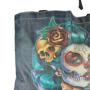 Super cute and handy canvas shoulder tote with Dia de los Muertos Day of the Dead Sugar Skull colorful artwork on both sides.