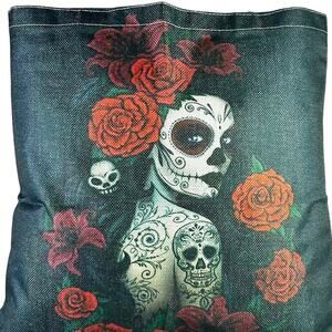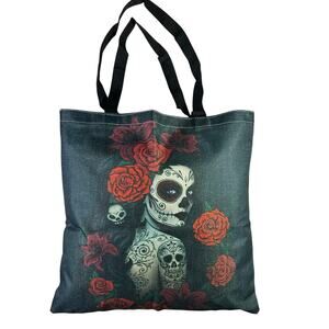 Super cute and handy canvas shoulder tote with Dia de los Muertos Day of the Dead Sugar Skull Roses colorful artwork on both sides.
