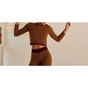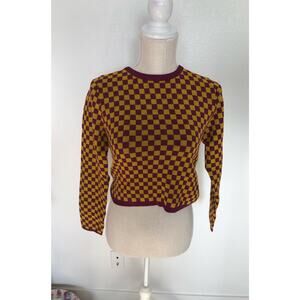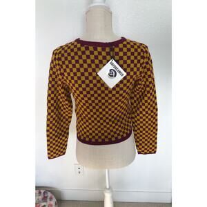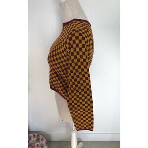 This fun and stylish cropped pullover sweater is perfect for seasonal transitions. It is a fitted style that has a nice stretch so it accents your silhouette. It comes in a jewel-toned color pallet of fig purple and golden yellow. The checkered pattern is a fun way to update your wardrobe. It is a crew neckline. New with tags.
