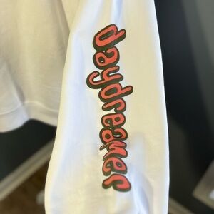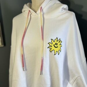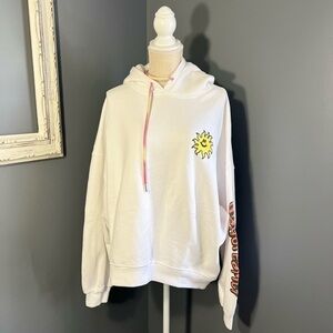 90s rave vibe of peace and happiness. Oversized, roomy hoodie. Daydreamer graphic throughout.