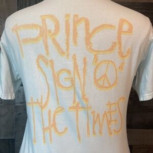 This Daydreamer tee celebrates The Purple One! On the front you can see Prince in black and white with his name in yellow and orange. On the back it says ‘Prince Sign ‘O’ The Times.’ It is gently worn and is in excellent condition!