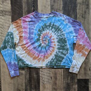 This is a Daydreamer crop top in a candy-colored spiral tie dye pattern. It is in excellent condition. It is a size small, and the last three images show measurements. Long sleeves, ribbed crewneck, raw cropped hem, 100% cotton.