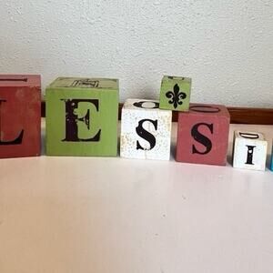 Set of 9 Dayspring wooden blocks for creating words. Assorted sizes and colors. Larger block is 3 1/2 “ square, medium is 2 1/2” square, small is 1 1/2”. Able to create a lot of words!