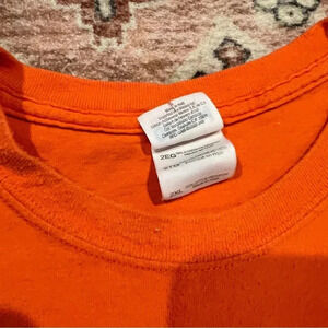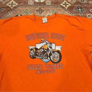 Daytona Beach Bike Week 2010 Orange Tee Shirt. Features a graphic of a Harley Davidson motorcycle.