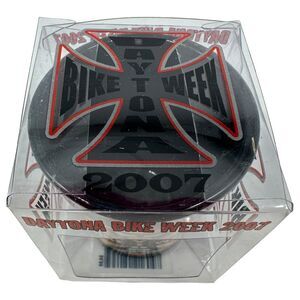 This 2007 Daytona Beach Bike Week Cross Shot Glass features a solid black pattern with a cross that says “Daytona Bike Week 2007”.