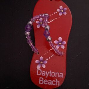 Details: Unbranded keychain red flip flop souvenir from Daytona Beach Florida the flowers are painted on the beads are glass