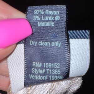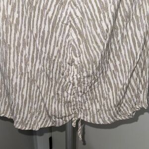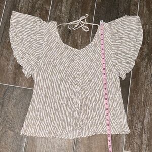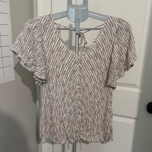 Chic V-neck blouse with beige and white stripes. Has a very pretty glittery gold detail as well. Features a tie-back detail. Perfect for casual wear.