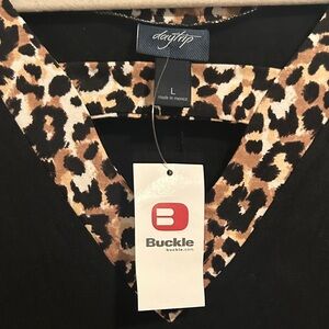 Chic black blouse featuring a bold leopard print neckline. Perfect for stylish outings.