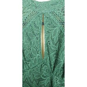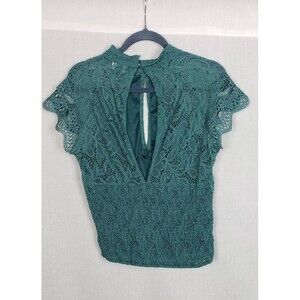 Daytrip Blouse M Teal Green Smocked Lace Mock Neck Keyhole Dainty Feminine Fall