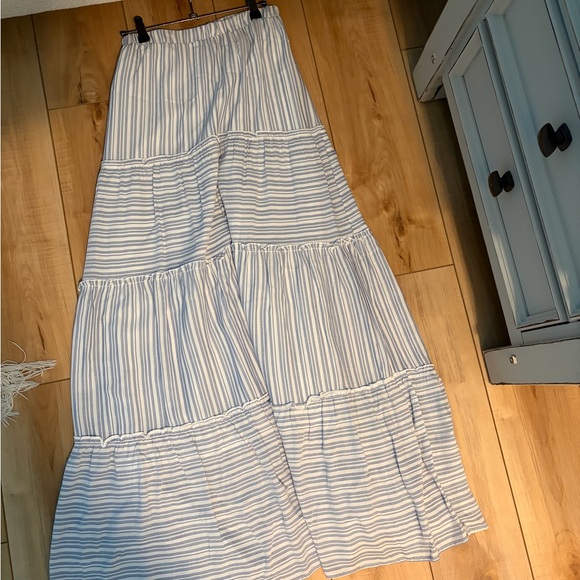 Chic tiered maxi skirt with blue and white stripes. Ideal for casual wear.
