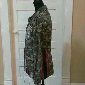 Camo jacket with embroidered sugar skulls and ethnic style trim. Has pull strings at bottom hem. Pockets are deep and also lined with trim. Size Medium. Measues: pit to pit 17". Very good condition.