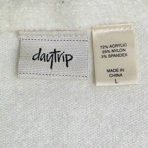Daytrip women’s longline cardigan, size Large. Cream, red, tan, and navy chevron colorblock pattern with front button closure. 72% acrylic, 25% nylon, 3% spandex. Cozy, soft, and stylish.