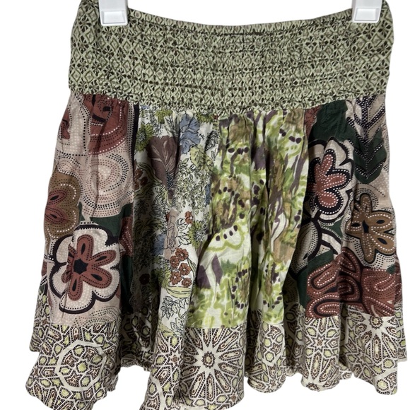 Embrace a bohemian vibe with this floral patchwork skirt. Featuring a blend of green and brown hues, this skirt is perfect for a casual day out.