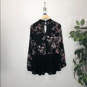 A stunning choker neck tunic with lace details around the keyhole cut out on the chest. Buttons on the back of the neck over another keyhole cutout. Elastic. At the end of the sleeves and a flowy body.