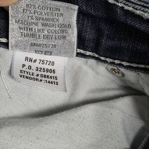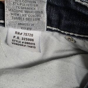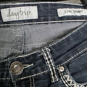 Daytrip Lynx Skinny jeans in women’s size 29L. Dark wash denim with light fading and contrast stitching. Features embroidered flap back pockets with metal button detail, mid-rise skinny fit, and stretch fabric for comfort. Made from 81% cotton, 17% polyester, and 2% spandex. Style #DBK415, made in China.