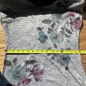 Women's lightweight overlay shirt/top, Daytrip brand. Multi-toned grey with floral design in shades of purple and turquoise, with a little antiqued brass embellishments. No sleeves, stopping at just off the shoulder. Black lace V insert on the back. Excellent layered with a cami and a vest/flair. Originally purchased at The Buckle. I'd cut off the tag since it was visible through the lace...most likely size L, considering that the Buckle sizes run small. Laying flat the waist measures 16 inches across, so compare with your existing wardrobe. Length 28 inches.