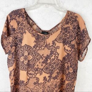 Daytrip by Buckle Classic Floral Paisley Print Tan Loose Blouse Shirt Top. Short Sleeves. Scoop Neck. Open Back / Button Down / Gold Button Up Buttons. Back Criss Cross Slit. Cute & Comfy. Loose & Lightweight. Great Condition. No Stains or Rips.