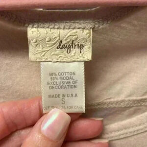 Light khaki color. Peace sign has gun metal embellishments. Ties in the front for perfect fit. Smoke free home. Orders shipped next business day.