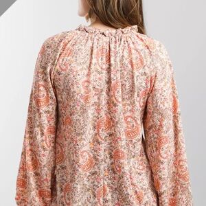 Daytrip v-neck, ruffle blouse. Paisley pattern with pinks, browns and peach colors. The flowy fabric and relaxed fit make it a perfect choice for a casual yet sophisticated look. 96% polyester and 4% spandex. Excellent condition, only worn a few times. From a smoke and pet free home.