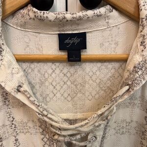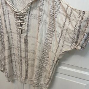 This relaxed blouse from Daytrip features a stylish lace-up front and a unique sailor collar, crafted in soothing tan and cream tones. Size L. Lightweight and flowy. Great condition!