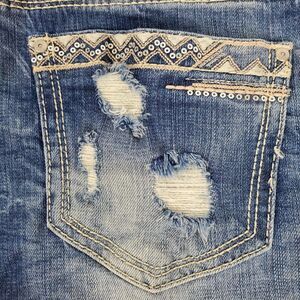 Factory Distressed, Aztec Western Cream White Embroidered Silver Sequin Embellished Back Pockets,