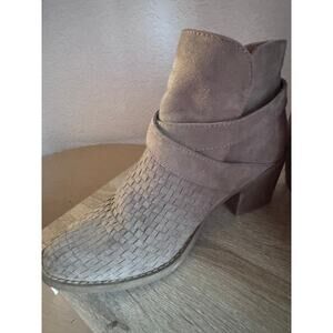 Daytrip women's woven suede slip-on ankle boots in size 6.5. These light tan/beige boots feature a stacked block heel, woven detail at the front, and a side buckle accent. Easy to slip on and stylish for casual or dressed-up outfits. Please note there is wear and some slight rotting on the inner lining, as shown in photos; exterior and soles remain in good condition. Perfect for pairing with jeans or dresses. See all pictures for details before purchase.