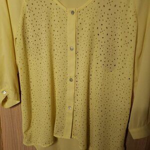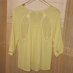 Daytrip women’s yellow silky lazer cut high low top with cutout back detail large. Gently used condition. Measurements are: 21 ½" sleeve (measured from neckline), 26 ½" from shoulder to shortest part of hem, and 21” from armpit to armpit.