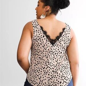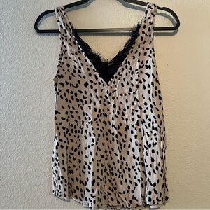 Stylish V-neck tank with lace detail. Black and cream pattern adds elegance. Perfect for casual outings.