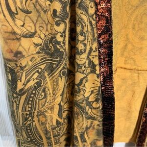 Chic open cardigan with artistic patterns. Features a blend of yellow and brown tones. Including sequence and rhinestones.