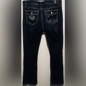Slim fit, lightly distressed, boot cut with no signs of wear and tear. These jeans have been very well taken care of!