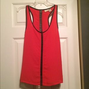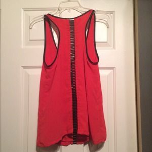 Daytrip reddish orange tank top with faux leather trim and cutout down center of front and back. Would look cute with a cardigan for fall! Only worn twice, in great condition!
