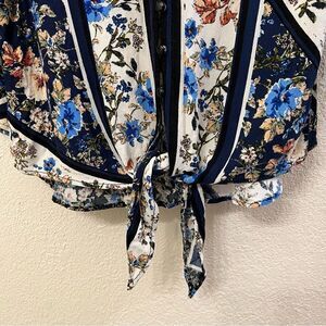 This bright floral pattern v-neck top is from Daytrip. The item has a button front with a tie at the bottom. The sleeves are wide. It is lite weight perfect for the warm weather. The top is made out of 100% rayon. The size is XL. The measurements are 24” L x 18” W (pit to pit) x 15” sleeve (shoulder to cuff). This fun top has been gently worn but is in very good condition.