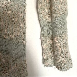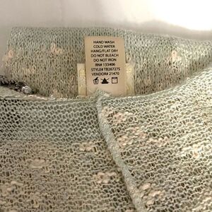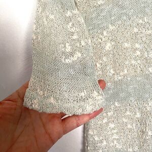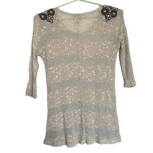 Stunning and unique sheer knit sweater with embellished shoulder detail from daytrip, size small. Featuring scoop neckline, a striped cream/tan & mint pattern in a soft sheer knit fabric, with 3/4 sleeves. Great preworn condition with minor wear noted to fabric throughout, it’s only been washed according to delicate instructions ✨