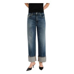 Daze Denim Eastside High Rise Loose Fit Wide Leg Jeans in Blue Crush Hour Wash. Take on the town in this versatile high rise loose jean. Rolled cuffs and authentic highs and lows add character to this it-girl fit. Constructed from our Tough Love fabric, this jean holds its shape but yields to your body in all the right ways.
