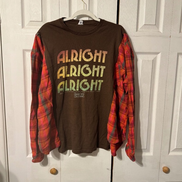 Dazed & Confused Alright Alright Alright Upcycled Graphic Tee/Flannel. The size of the t-shirt is not readable on the tag anymore but see below for accurate measurements for your fit. This is such a unique piece and have never seen another like it. If you love this movie, this is a must get.