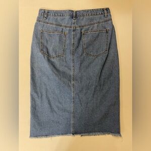 Denim skirt has raw hem with front kick pleat. Gently worn and in good used condition.