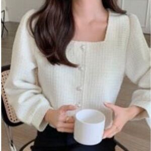 This elegant cream blouse features a textured design with a classic button-up front. Perfect for adding a touch of sophistication to any outfit.