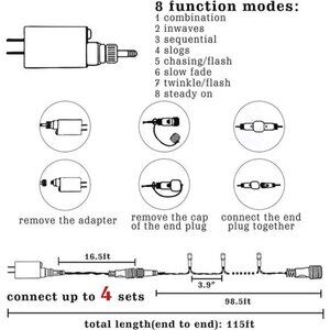 🧿Charming Xmas Lights: Christmas 300 LED string lights, use UL-certified 29V low-voltage plugs to ensure the safe use of the product. The outdoor Christmas lights has 16.5 FT leading wire, and the light string is 98.5 FT, total length is 115 FT, the bulb spacing is 3.9 inch. The string light using green wire, which looks more natural and suitable for winter using.