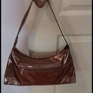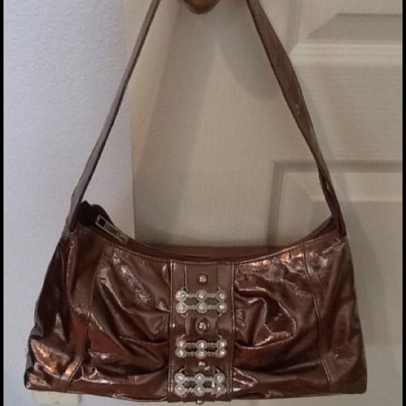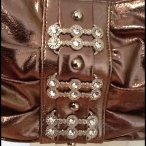 Gorgeous bronze handbag with gem detail and zippered compartments, including one on the back side. Great for the evening!