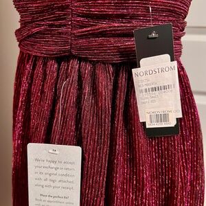 Details: Sparkling metallic pleats throughout, creating a beautiful drape