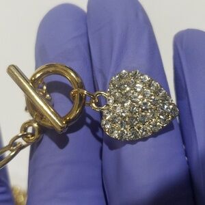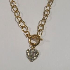This exquisite necklace features a stunning heart-shaped pendant encrusted with dazzling crystals, adding a touch of sparkle and elegance to your outfit. The pendant is suspended on a sleek 20-inch gold-tone chain, offering a timeless and sophisticated design perfect for special occasions or everyday wear. Lightweight and comfortable, this piece makes an excellent gift for loved ones or a charming addition to your jewelry collection.