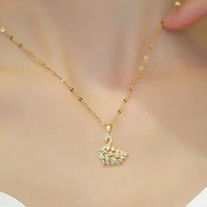 Adorn your neckline with this graceful swan pendant necklace, featuring a brilliant bird design meticulously set with dazzling, high-quality crystals in a striking marquise and round cut. Suspended from a delicate, 18K gold-plated chain, this elegant piece perfectly captures the beauty and purity of the swan, making it a luxurious accessory or an unforgettable gift for someone special.