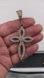 This vintage sterling silver cross pendant features a large bezel set CZ in the center with the four arms adorned with prong set CZs. The cross has a nice weight as it is cast, not stamped from sheet metal. The oversized bale has a nugget texture and is stamped 925 on the inside. The pendant measures 3 1/4 by 1 5/8”.