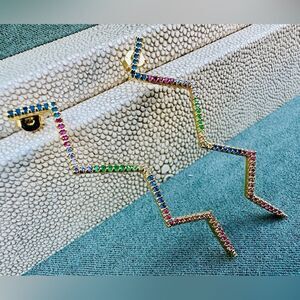 Make a bold statement with these stunning zigzag-shaped earrings, adorned with brilliant multicolor stones that sparkle with every movement. The gold-plated finish adds a touch of luxury, while the unique lightning bolt-inspired design makes them truly one of a kind. Perfect for any occasion—whether you’re dressing up for a night out or adding a pop of color to your everyday look.