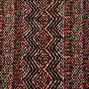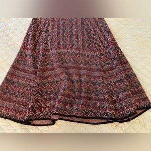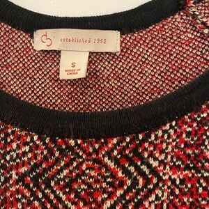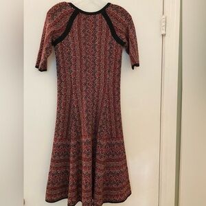 This dress is so pretty. Classic fit n flare style in a substantial sweater knit fabric. The colors are red, black and cream, and trimmed in black at the neckline, sleeves and hen. Half sleeve length. Pretty fall colors! It would look great with tall boots.
