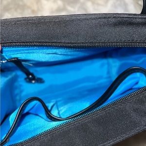 Black fabric bag with silver feet on the bottom and a zipper top featuring the Superman logo on the pull tag!