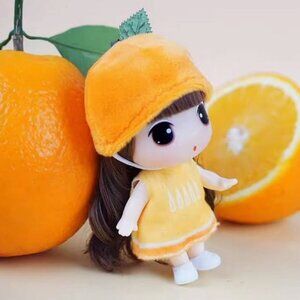 Ddung keychain featuring a sweet little doll dressed up in fruit (orange) costume.
