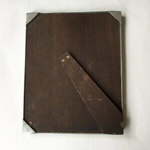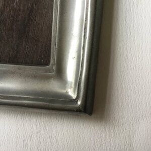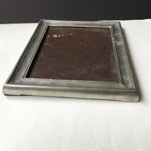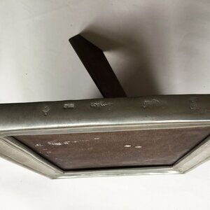 Features a pewter frame and a wooden backing. Stamped on one side of the frame. Missing glass cover insert.