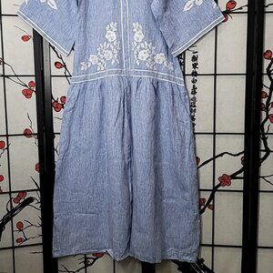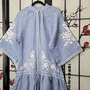 De Castro Swan Dress in Light Denim Linen with White Floral Embroidery