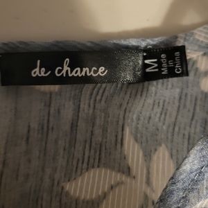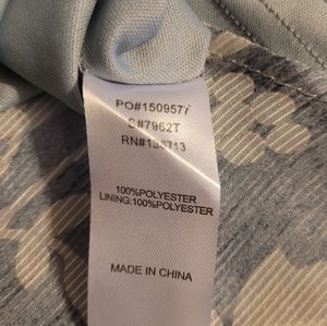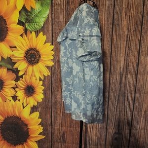 Very pretty. Light and easy to wear, dusty blue white white floral print, shirt sleeve blouse. Nearly sheer top front and back with body lined. Round neckline, high-low hemline and split ruffled sleeves with ruffles front and back at neckline. Four button closure at the back neckline. Made from 100% polyester material. Excellent condition🌻